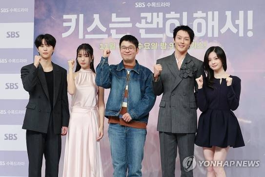 배우 김무준(왼쪽부터), 안은진, 김재현 연출, 장기용, 우다비가 5일 서울 양천구 목동 SBS사옥에서 열린 SBS수목드라마 '키스는 괜히 해서!' 제작발표회에서 포즈를 취하고 있다. 2025.11.5
